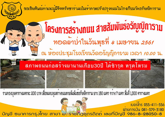 โรงเรียนวัดอรัญญิการาม ขอเชิญชวนศิษย์เก่าและผู้มีจิตศรัทธา ร่วมทอดผ้าป่าสร้างถนน สายสัมพันธ์อรัญญิการาม สามารถโอนเงินผ่านทางบัญชีธนาคารกรุงไทย สาขา ม.ราชภัฏอุตรดิตถ์ เลขที่บัญชี 986-8-28050-8 ทอดผ้าป่าในวันพุธที่ 4 เมษายน 2561 |