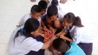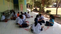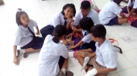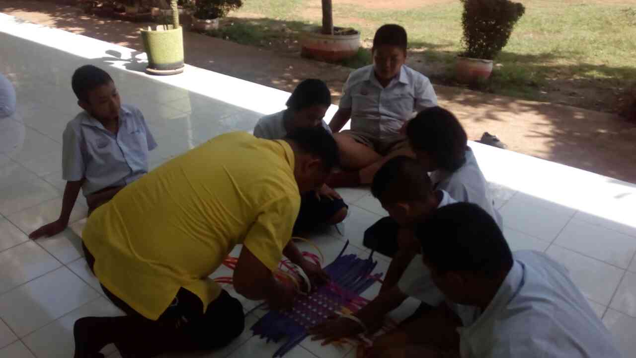 นักเรียนสานผลิตภัณฑ์จากเส้นพลาสติก กิจกรรม 1 โรงเรียน 1 อาชีพ 1ผลิตภัณฑ์ โดยมีว่าที่ร.ท.พงษ์เทพ นาคมี วิทยากรสอนอาชีพ มาให้ความรู้กับนักเรียน |