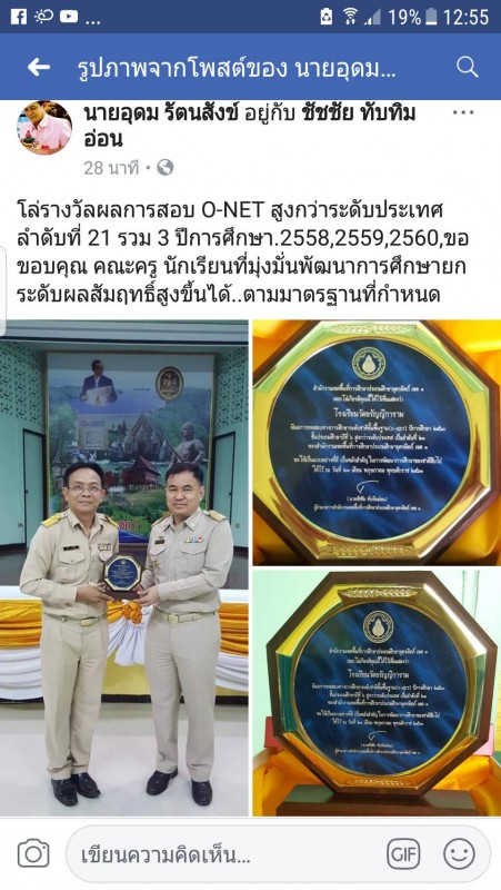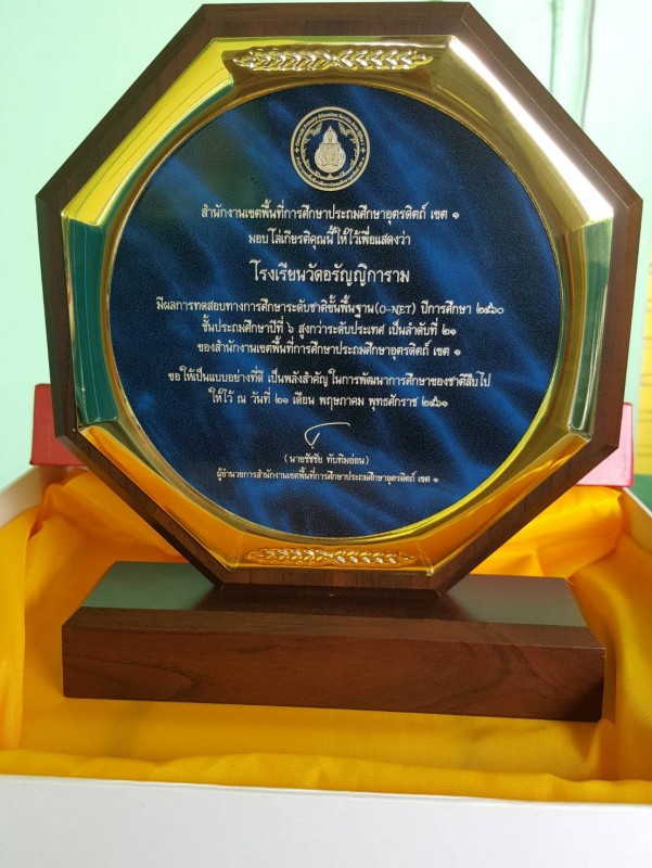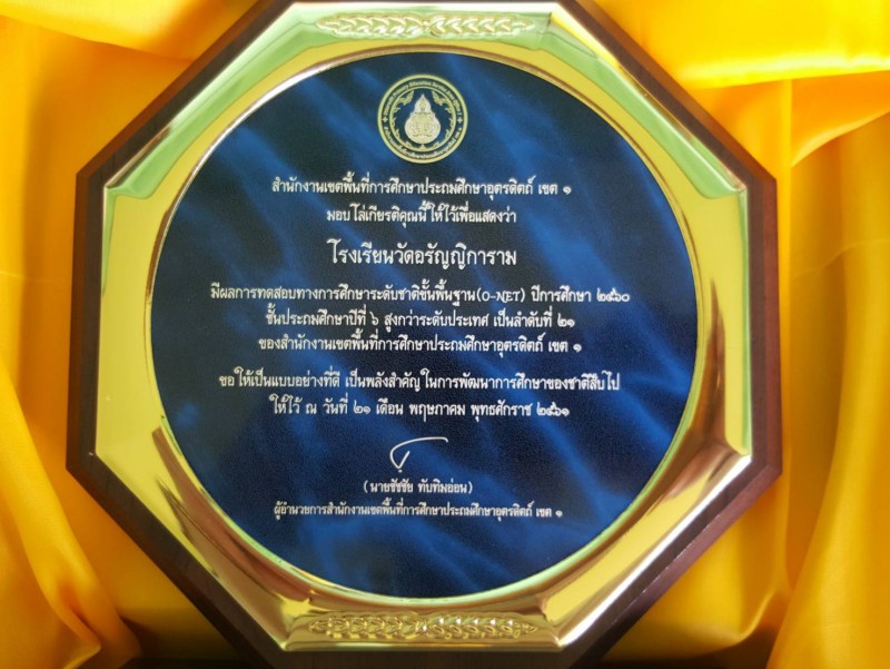ผอ.อุดม รัตนสังข์รับโล่รางวัลโรงเรียนวัดอรัญญิการามมีผลการทดสอบระดับชาติ onet. ชั้นประถมศึกษาปีที่6